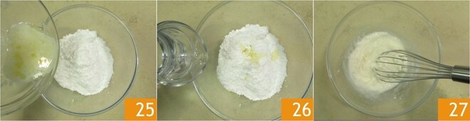 Geben Sie den Puderzucker in eine Schüssel mit der geschmolzenen Butter 24, dann rühren Sie mit einem Schneebesen, fügen Sie so viel lauwarmes Wasser hinzu 25, bis die gewünschte Konsistenz erreicht ist 26.