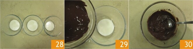Teilen Sie die erhaltene Glasur in 3 Schüsseln 27. Lassen Sie die erste Schüssel naturbelassen. In die zweite Schüssel geben Sie die geschmolzene Schokolade, die Sie zuvor im Wasserbad oder in der Mikrowelle geschmolzen haben 28, und mischen Sie, um zu vermengen 30.