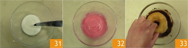 Färben Sie die dritte Schüssel mit dem Lebensmittelfarbstoff 31 und mischen Sie, um einen gleichmäßigen Farbton zu erhalten 32. Jetzt sind Sie bereit, Ihre Donuts zu glasieren, indem Sie eine Seite in die Glasur tauchen, um sie gleichmäßig zu bedecken 33.
