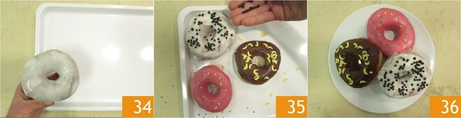Legen Sie die glasierten Donuts auf ein Tablett 34 und dekorieren Sie sie mit Konfetti und Zuckerstreuseln nach Belieben 35. Ihre Donuts sind bereit, genossen zu werden 36!