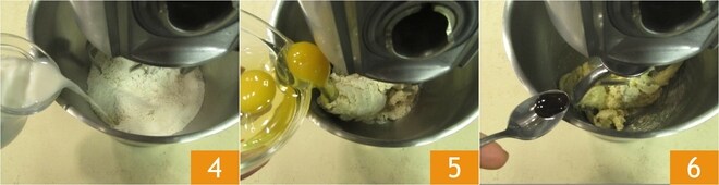 Schalten Sie die Küchenmaschine auf mittlere Geschwindigkeit ein und gießen Sie die lauwarme Milch langsam hinzu 4. Fügen Sie die Eier einzeln hinzu 5 und aromatisieren Sie mit dem Vanilleextrakt 6.