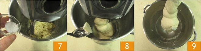 Zum Schluss geben Sie auch das Salz hinzu 7 und arbeiten Sie weiter, bis sich der Teig von den Schüsselwänden löst. Dann können Sie die weiche Butter, ein Stückchen nach dem anderen, hinzufügen, wobei darauf zu achten ist, dass das vorherige Stück vollständig aufgenommen wurde, bevor ein weiteres hinzugefügt wird 8; das dauert etwa 15-20 Minuten. Sie sollten einen glatten und homogenen Teig erhalten 9.