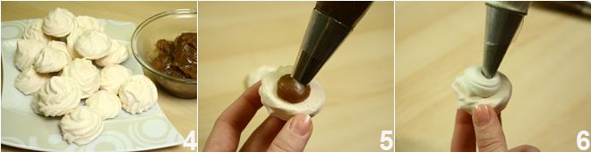 Wenn die Baisers fertig und kalt sind 4, geben Sie die Maronencreme in einen Spritzbeutel mit glatter Tülle und spritzen Sie etwas davon 5 auf die flache Seite der Hälfte der vorbereiteten Baisers. Schlagen Sie die Sahne und garnieren Sie auf die gleiche Weise wie mit der Maronencreme die flache Seite der anderen Hälfte der Baisers 6. Setzen Sie die beiden Hälften zusammen und stellen Sie sie in den Kühlschrank, um abzukühlen, danach servieren Sie sie.