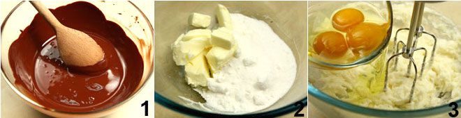 Die Zartbitterschokolade im Wasserbad oder in der Mikrowelle schmelzen und abkühlen lassen 1. In der Zwischenzeit die Butter in Würfel schneiden und bei Zimmertemperatur weich werden lassen, dann den Zucker und die Vanillemark hinzufügen 2 und mit einem Mixer schlagen, bis eine helle und cremige Masse entsteht; dabei nach und nach die Eier hinzufügen 3.