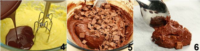 Schließlich das Salz und die mittlerweile abgekühlte geschmolzene Schokolade hinzufügen 4. Anschließend das zuvor gesiebte Mehl mit dem Backpulver und zuletzt die in kleine Würfel geschnittene Milchschokolade hinzufügen 5. Alle Zutaten gut vermengen und dann den Teig löffelweise auf ein mit Backpapier ausgelegtes Backblech geben 6. Auf einem normalen Backblech können bis zu sechs gut voneinander entfernte Teighäufchen platziert werden (da die Kekse beim Backen auseinanderlaufen) und im vorgeheizten Umluftofen bei 180° für etwa 15-20 Minuten backen. Die Kekse mit einem Spatel herausnehmen und auf einem Rost abkühlen lassen. Auf diese Weise fortfahren, bis der Teig aufgebraucht ist, mit dem etwa 15 Kekse hergestellt werden können, die nach dem Backen einen Durchmesser von etwa 8-9 cm haben.