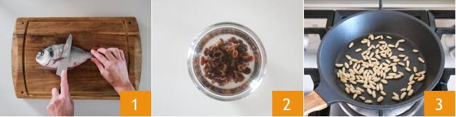 Um die Dorade in Folie auf sizilianische Art zuzubereiten, nehmen Sie die bereits ausgenommenen Doraden und schneiden Sie die Seitenflossen ab 1. Vergrößern Sie dann mit der Schere den bereits vorhandenen Bauchschnitt, um mehr Platz für die Füllung zu haben. Entfernen Sie die äußeren Schuppen, indem Sie mit der Messerklinge reiben, und spülen Sie dann gründlich unter fließendem Wasser ab. Spülen Sie auch die Rosinen und weichen Sie sie mindestens 10 Minuten in kaltem Wasser ein 2. Rösten Sie die Pinienkerne in der Pfanne 2-3 Minuten, um sie aromatischer zu machen 3.