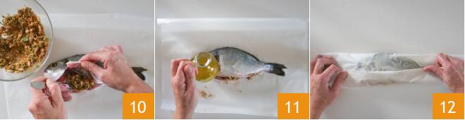 Legen Sie jede Dorade auf ein rechteckiges Stück Backpapier, das sie vollständig umschließen kann. Füllen Sie sie mit der aromatischen Mischung 10 und bestreichen Sie sie außen mit einem Schuss Öl 11. Verschließen Sie jeden Fisch in dem Backpapier 12,