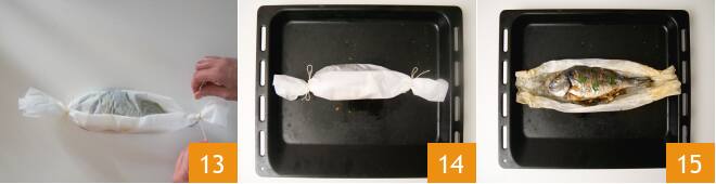 indem Sie es dann mit Küchengarn zu einem Bonbon schließen 13. Backen Sie die Doraden im vorgeheizten Umluftofen bei 200° für etwa 15-20 Minuten 14 in der mittleren Ofenposition. Nehmen Sie die Doraden in Folie auf sizilianische Art aus dem Ofen 15 und genießen Sie sie heiß!