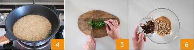 Rösten Sie für einige Minuten die Semmelbrösel in einer großen, antihaftbeschichteten Pfanne 4, dabei häufig umrühren. Hacken Sie die Petersilie 5. Geben Sie in eine Schüssel die gerösteten Semmelbrösel, die gerösteten Pinienkerne, die abgetropften und ausgedrückten Rosinen 6,