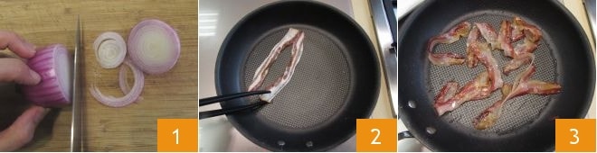 Um den Ei-Burger zuzubereiten, schälen und schneiden Sie zuerst die Zwiebel in Scheiben 1. Legen Sie die Speckscheiben in eine heiße Pfanne 2 und braten Sie sie bei mittlerer bis niedriger Hitze 4-5 Minuten lang. Wenn sie schön knusprig und goldbraun sind 3