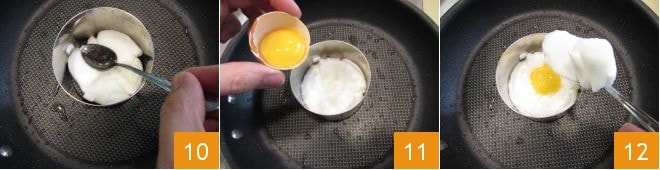 Geben Sie einen Löffel geschlagenes Eiweiß hinein 10, dann ein Eigelb 11 und bedecken Sie es mit einem weiteren Löffel Eiweiß 12.