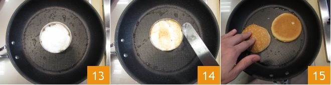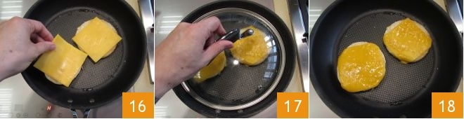 dann drehen Sie es um, legen Sie die Cheddarscheiben darauf 16, bedecken Sie es mit dem Deckel 17 und erhitzen Sie es, bis der Käse geschmolzen ist 18.