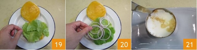 Nehmen Sie es jetzt vom Herd und belegen Sie die Basis des Brötchens mit den knusprigsten Blättern des Salats 19, die zuvor gewaschen und getrocknet wurden, und einigen Zwiebelscheiben 20. Jetzt nehmen Sie das Ei aus der Form, indem Sie mit einem scharfen Messer entlang des Randes fahren, um den Vorgang zu erleichtern 21.