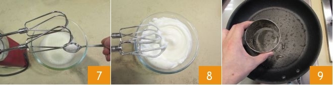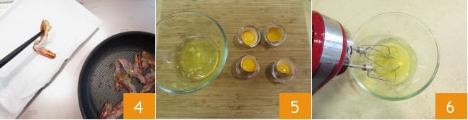 nehmen Sie sie aus der Pfanne und lassen Sie sie auf Küchenpapier abtropfen 4. Trennen Sie die Eiweiße von den Eigelben (für das Rezept benötigen Sie 4 Eigelbe und 5 Eiweiße; das übrig gebliebene Eigelb können Sie wie am Ende des Rezepts angegeben verwenden) und achten Sie darauf, jedes Eigelb separat in einer kleinen Schüssel aufzubewahren 5. Schlagen Sie die 5 Eiweiße mit einem elektrischen Mixer 6