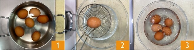 Um das Egg Sandwich zuzubereiten, legen Sie zuerst die Eier in einen kleinen Topf, bedecken Sie sie mit kaltem Wasser und bringen Sie sie zum Kochen 1. Nach 6,5 Minuten ab dem Siedepunkt gießen Sie 4 Eier ab und legen Sie in eine Schüssel mit Eiswasser 2: Sie werden die Konsistenz von weich gekochten Eiern haben und können in jedes Sandwich 1 eingefügt werden. Die restlichen Eier gießen Sie nach 8,5 Minuten ab dem Siedepunkt ab und legen sie in eine andere Schüssel mit Eiswasser 3: Sie werden die Konsistenz von hart gekochten Eiern haben.