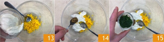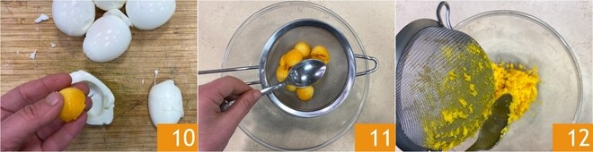 Schälen Sie die hart gekochten Eier und trennen Sie das Eiweiß vom Eigelb 10. Geben Sie die Eigelb in ein Sieb und drücken Sie sie mit der Rückseite eines Löffels 11, um sie zu zerbröseln 12.