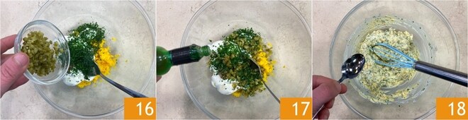Fügen Sie auch die gehackten Gurken 16 und die scharfe Soße 17 hinzu. Mischen Sie alles mit einem Schneebesen und würzen Sie es mit ein paar Tropfen Essig 18.