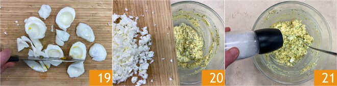 Hackeln Sie nun die Eiweiße der hart gekochten Eier mit einem Messer 19 und geben Sie sie in die Mischung 20. Mischen Sie gut, um sie zu integrieren, dann würzen Sie mit Salz 21 und Pfeffer 22.