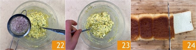 Fügen Sie schließlich die gut abgetropfte gehackte Schalotte hinzu 22 und mischen Sie erneut, um alles zu integrieren 23. Sie sind bereit, Ihr Sandwich zusammenzustellen: Schneiden Sie 8 Scheiben Sandwichbrot 24 und entfernen Sie die Kruste.