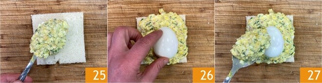 Verteilen Sie einen Löffel der Eiersalat auf der ersten Scheibe 25, legen Sie dann das weich gekochte Ei in die Mitte 26 und bedecken Sie es mit einem weiteren Löffel Eiersalat 27.