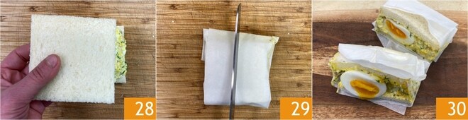 Schließen Sie mit der zweiten Scheibe Brot 28. Nun müssen Sie das Egg Sandwich in Backpapier einwickeln, damit Sie es leichter genießen können: Jetzt können Sie es in der Mitte mit einem gezackten Messer halbieren 29. Wiederholen Sie den Vorgang, um die anderen 3 Sandwiches zu formen. Ihr Egg Sandwich ist bereit, genossen zu werden 30!