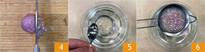 Schälen und hacken Sie die Schalotte fein 4. Geben Sie in einer Schüssel Wasser mit ein paar Tropfen Weißweinessig 5 und lassen Sie die gehackte Schalotte 6 einweichen. Dies wird den starken Geschmack mildern.
