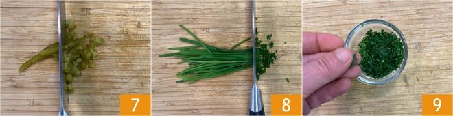 Hacken Sie die eingelegten Gurken 7, den Schnittlauch 8 und die Petersilie fein. Mischen Sie die Kräuter in einer kleinen Schüssel und fügen Sie auch den Dill hinzu, indem Sie die Blätter von Hand abtrennen 9.