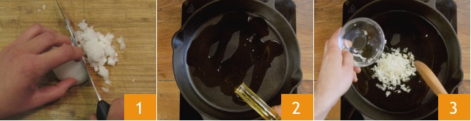 Um Eier und Erbsen zuzubereiten, putzen und hacken Sie zuerst die Zwiebel fein 1. Geben Sie einen Schuss Öl in einen Topf 2 und fügen Sie die Zwiebel hinzu 3.