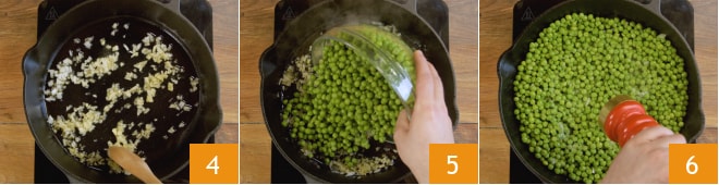 Lassen Sie die Zwiebel bei schwacher Hitze ein paar Minuten anbraten 4, gelegentlich umrühren, dann die Erbsen hinzufügen 5 und mit Salz und Pfeffer abschmecken 6. Kochen Sie die Erbsen etwa 10 Minuten bei schwacher Hitze, gelegentlich umrühren.