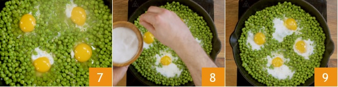 Schlagen Sie nun die Eier vorsichtig in die Pfanne mit den Erbsen, achten Sie darauf, dass sie intakt bleiben 7. Kochen Sie, bis der gewünschte Gargrad erreicht ist: Wenn Sie flüssiges Eigelb bevorzugen, reichen 5 Minuten, ohne Deckel, bis das Eiweiß weiß wird. Wenn Sie das Eigelb hart haben möchten, dann für etwa 10 Minuten mit Deckel kochen. Würzen Sie schließlich mit einer weiteren Prise Salz 8 und Pfeffer nach Geschmack: Servieren Sie Ihre Eier und Erbsen gut heiß 9!