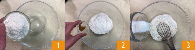 Um die Crêpes ohne Eier vorzubereiten, schmelzen Sie als erstes die Butter in einem kleinen Topf und stellen Sie sie zur Seite. Geben Sie das Mehl 1, den Zimt 2 und eine Prise Salz in eine Schüssel und mischen Sie schnell. Fügen Sie die Milch hinzu und rühren Sie weiter 3, um die Bildung von Klumpen zu vermeiden.