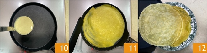 Gießen Sie einen Schöpflöffel Teig in die Mitte 10 und verteilen Sie ihn, indem Sie die Pfanne schwenken, über die gesamte Oberfläche. Backen Sie ihn bei mittlerer Hitze etwa eine Minute lang. Wenn sich die Crêpe von den Rändern löst, können Sie sie wenden 11 und die andere Seite ebenfalls eine Minute lang backen, bis sie goldbraun ist. Verfahren Sie so weiter, bis der Teig aufgebraucht ist. Stapeln Sie die Crêpes während des Backens auf einem Servierteller 12.
