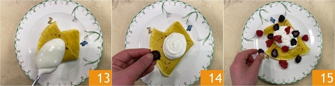 Falten Sie die Crêpes zweimal in der Mitte, um Dreiecke zu formen, und garnieren Sie sie mit der Joghurtcreme 13. Schließlich vervollständigen Sie sie mit Himbeeren, Brombeeren 14 und ein paar Minzblättern. Ihre Crêpes ohne Eier sind bereit, serviert zu werden 15!