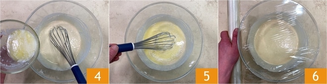 Fügen Sie auch die abgekühlte geschmolzene Butter hinzu 5 und rühren Sie noch einmal, um alles zu vermischen 5. Decken Sie es mit Frischhaltefolie ab 6 und lassen Sie es 30 Minuten im Kühlschrank ruhen.