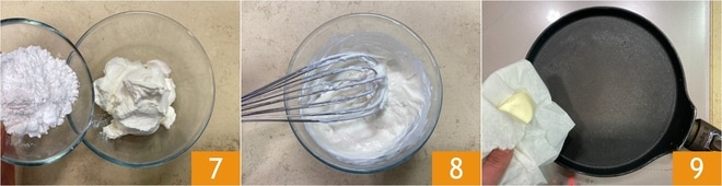 Bereiten Sie in der Zwischenzeit die Füllung vor: Geben Sie den Joghurt in eine Schüssel, fügen Sie den Puderzucker hinzu 7 und rühren Sie, bis eine cremige und homogene Mischung entsteht 8. Fetten Sie eine Crêpes-Pfanne mit 24 cm Durchmesser (oder eine beschichtete Pfanne der gleichen Größe) leicht mit Butter ein.