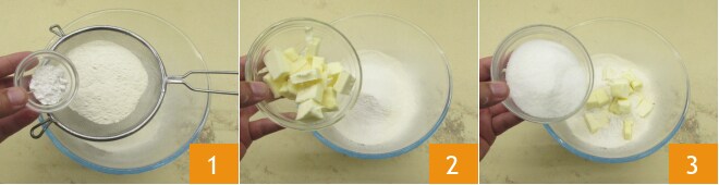 Um die eierlosen Kekse zuzubereiten, sieben Sie zuerst das Mehl und das Backpulver in eine Schüssel 1. Fügen Sie die zuvor in Stücke geschnittene und nicht zu kalte Butter hinzu 2, sowie den Zucker 3,