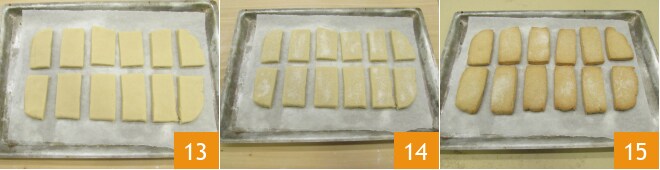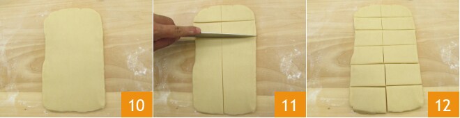Rollen Sie einen rechteckigen Teig von 1 cm Dicke aus, der etwa 24x16 cm misst 10. Schneiden Sie mit einem Messer die Teigplatte der Länge nach in zwei Hälften und dann in 6 horizontale Streifen von 4 cm 11, um insgesamt 12 Kekse zu erhalten 12.