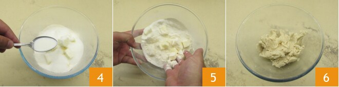 eine Prise Salz und die Milch 4. Vermischen Sie die Zutaten schnell 5, bis Sie eine homogene und kompakte Masse erhalten 6.