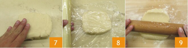 Formen Sie einen Teig 7 und wickeln Sie ihn in Frischhaltefolie 8, um ihn für mindestens zwei Stunden im Kühlschrank zu festigen. Nehmen Sie dann den Teig heraus und machen Sie ihn mit den Händen weich, bestäuben Sie sowohl die Oberseite als auch die Unterseite des Teigs mit Mehl, um ihn mit dem Nudelholz besser ausrollen zu können 9. Wenn nötig, können Sie ihn einige Augenblicke bei Raumtemperatur stehen lassen, damit er weich genug wird, um bearbeitet zu werden.