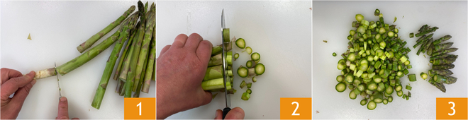 Um die Eier- und Spargelwolken vorzubereiten, widmen Sie sich zuerst dem Wie man Spargel putzt. Entfernen Sie den holzigen Teil des Spargels 1, dann schneiden Sie ihn in Scheiben 2, wobei die Spitzen ganz bleiben 3.