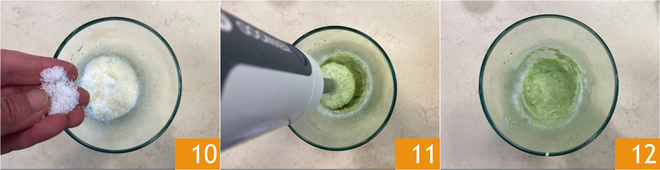 Würzen Sie mit Salz 10 und Pfeffer, dann pürieren Sie 11 mit einem Stabmixer, bis Sie eine glatte und homogene Creme 12 erhalten.