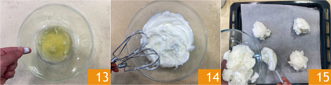 Kommen wir zu den Eiern: Trennen Sie das Eiweiß von den Eigelben, versuchen Sie, letztere ganz zu lassen. Geben Sie das Eiweiß in eine Schüssel und schalten Sie den Mixer ein, dann fügen Sie eine Prise Salz 13 hinzu und schlagen Sie weiter; Sie sollten eine schaumige und elastische Konsistenz 14 erhalten. Teilen Sie die entstandene Masse in 4 Haufen und legen Sie sie auf ein mit Backpapier ausgelegtes Blech 15.