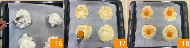 Mit der Rückseite eines Löffels machen Sie in der Mitte Vertiefungen, die die Eigelbe aufnehmen sollen 16, und versuchen Sie, die Form zu modellieren. Backen Sie im statischen Ofen bei 200° für 6 Minuten. Nehmen Sie sie dann heraus und lassen Sie die Eigelbe vorsichtig in die Vertiefungen gleiten 17, dann backen Sie erneut für weitere 2-3 Minuten 18.
