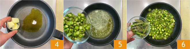 Lassen Sie in einer Pfanne die Butter im Öl zergehen 4. Fügen Sie die Spargelstiele hinzu 5 und kochen Sie sie bei mittlerer Hitze für 2 Minuten, dann geben Sie auch die Spitzen dazu 6. Braten Sie alles etwa 7 Minuten, so bleiben sie knusprig.