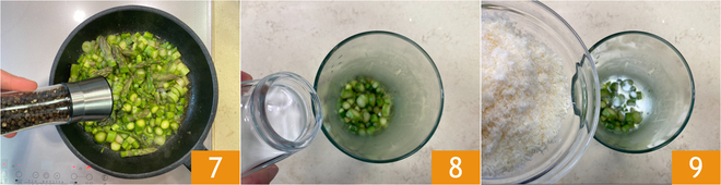 Salzen und pfeffern Sie 7. Nehmen Sie die Hälfte des Spargels heraus und geben Sie ihn in einen Behälter, dann fügen Sie die Sahne 8 und den geriebenen Parmesan 9 hinzu.