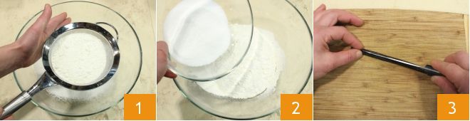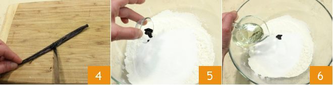 Um den eifreien Kuchen zuzubereiten, beginnen Sie damit, das Mehl und das Backpulver in einer großen Schüssel zu sieben 1, dann fügen Sie den Kristallzucker hinzu 2. Nehmen Sie die Vanilleschote und schneiden Sie sie der Länge nach auf 3