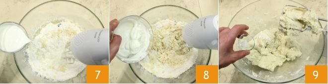 die frische Sahne 7 und den Joghurt 8 und beginnen Sie, alle Zutaten mit einem elektrischen Schneebesen zu vermengen (alternativ können Sie von Hand mit einem Schneebesen oder einer Küchenmaschine mischen). Vermischen Sie die Zutaten gut, fügen Sie eine Prise Salz hinzu 9.