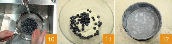 Der Teig ist nun fertig: Spülen Sie die Blaubeeren unter fließendem Wasser ab 10, trocknen Sie sie mit einem Küchentuch ab und geben Sie sie in die Schüssel 11. Vermengen Sie sie mit einem Holzlöffel in den Teig. Fetten Sie eine Backform mit einem Durchmesser von 24 cm ein und legen Sie sie mit Backpapier aus 12, indem Sie den Anweisungen der Kochschule folgen Wie man eine Kuchenform mit Backpapier auskleidet.