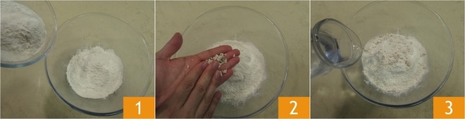 Um den Pizzateig vorzubereiten, haben wir uns entschieden, alles von Hand zu kneten, aber wenn Sie lieber die Küchenmaschine verwenden möchten, können Sie den gleichen Vorgängen folgen und den Haken bei mittlerer bis niedriger Geschwindigkeit verwenden. Als erstes geben Sie die Mehle in eine Schüssel 1, dann zerbröseln Sie die Hefe hinein 2 und gießen das Wasser nach und nach hinzu 3. Die ideale Wassertemperatur beträgt 25°C.