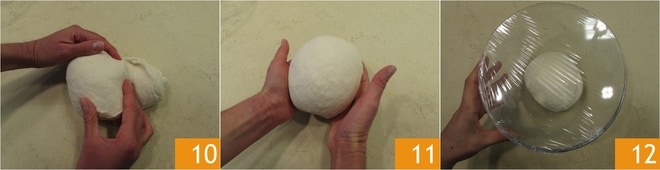 Nachdem Sie die 4 Falten gemacht haben, drehen Sie ihn auf sich selbst 10 und formen Sie ihn zu einer Kugel 11. Legen Sie den so geformten Teig in eine Schüssel, decken Sie ihn mit Frischhaltefolie ab und lassen Sie ihn gehen 12. Um es bequem zu machen, können Sie die Schüssel in den ausgeschalteten Ofen mit eingeschaltetem Licht stellen, so dass das Innere eine Temperatur von 26°C-28°C erreicht, ideal für das Gehen; alternativ können Sie die Schüssel auch an einem warmen Ort aufbewahren. Die Zeiten sind ungefähr, da jeder Teig, die Temperatur und die Wetterbedingungen das Gehen beeinflussen: Im Durchschnitt sollte der Teig etwa 6 Stunden benötigen, um sich im Volumen zu verdoppeln.